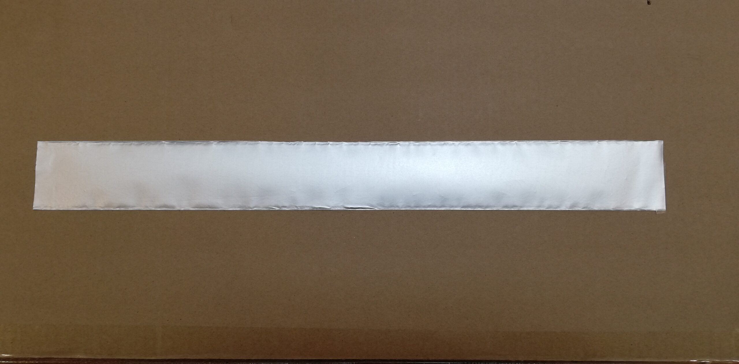 まずアルミテープを貼り付けたい刀身の長さより5cmほど長めに切ります。切ったアルミテープはアルミ面を下にして段ボール(もしくは作業台)にセロハンテープまたは両面テープで貼り付け、剥離紙をはがします。